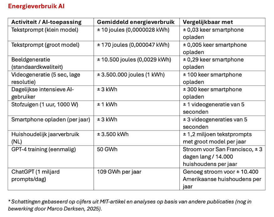 Onderzoekers aan de TU Delft werken aan energiezuinigere AI-modellen en ontwikkelden een plug-in die toont hoeveel energie een ChatGPT-vraag kost. Veel gebruikers blijken het verbruik te onderschatten. Google en Microsoft wijzen op hun groene ambities, maar geven geen harde cijfers.