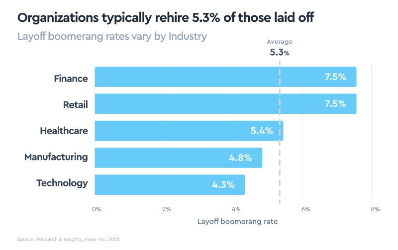 Uit een recent onderzoek van het in Canada gevestigde technologiebedrijf Visier blijkt dat meer dan 5 procent van de ontslagen medewerkers later terugkeert bij dezelfde werkgever. Volgens Andrea Derler van Visier is dat opvallend, omdat dit percentage jarenlang nauwelijks veranderde. Zij stelt dat organisaties AI soms gebruiken als makkelijke verklaring voor ontslagen, terwijl de werkelijke redenen anders zijn. Ze benadrukt dat er geen bewijs is dat AI op korte termijn massaal banen vervangt. Veel bestuurders hebben überhaupt nog geen helder beeld van wat AI wel en niet kan, wat het kost en wat het betekent voor hun organisatie.