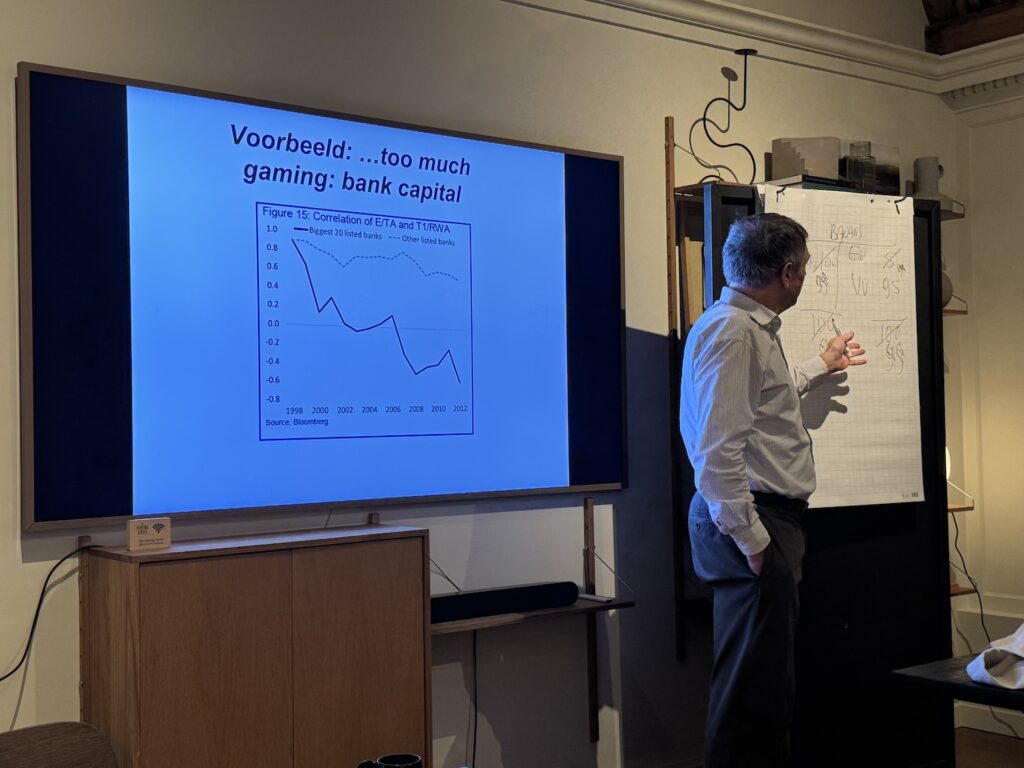 Arnoud Boot legde uit hoe meetregimes kuddegedrag veroorzaken. Als toezichthouders naar de financiële sector kijken met een bepaalde bril, en die bril wordt overgenomen door instellingen en hun adviseurs, dan gaat iedereen sturen op dezelfde meetbare grootheden. Mensen optimaliseren wat gemeten wordt en negeren wat niet gemeten wordt. Crises ontstaan vaak door wat niet in het model zat, door wat tussen de mazen van toezicht en metrics glipt.