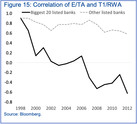 Tot eind jaren negentig bewogen beide cijfers vrijwel parallel. Een bank met veel eigen vermogen had ook een hoge gereguleerde Tier-1-ratio. Vanaf begin jaren 2000 verdwijnt die relatie echter snel, vooral bij de grootste banken. De correlatie wordt zwak en rond 2010 zelfs negatief. Dit duidt erop dat risicowegingen steeds strategischer werden ingezet. Banken konden een sterke T1/RWA-ratio rapporteren terwijl hun feitelijke leverage opliep. De risicogewogen ratio verloor daarmee een aanzienlijk deel van haar informatiewaarde als indicator van robuustheid.