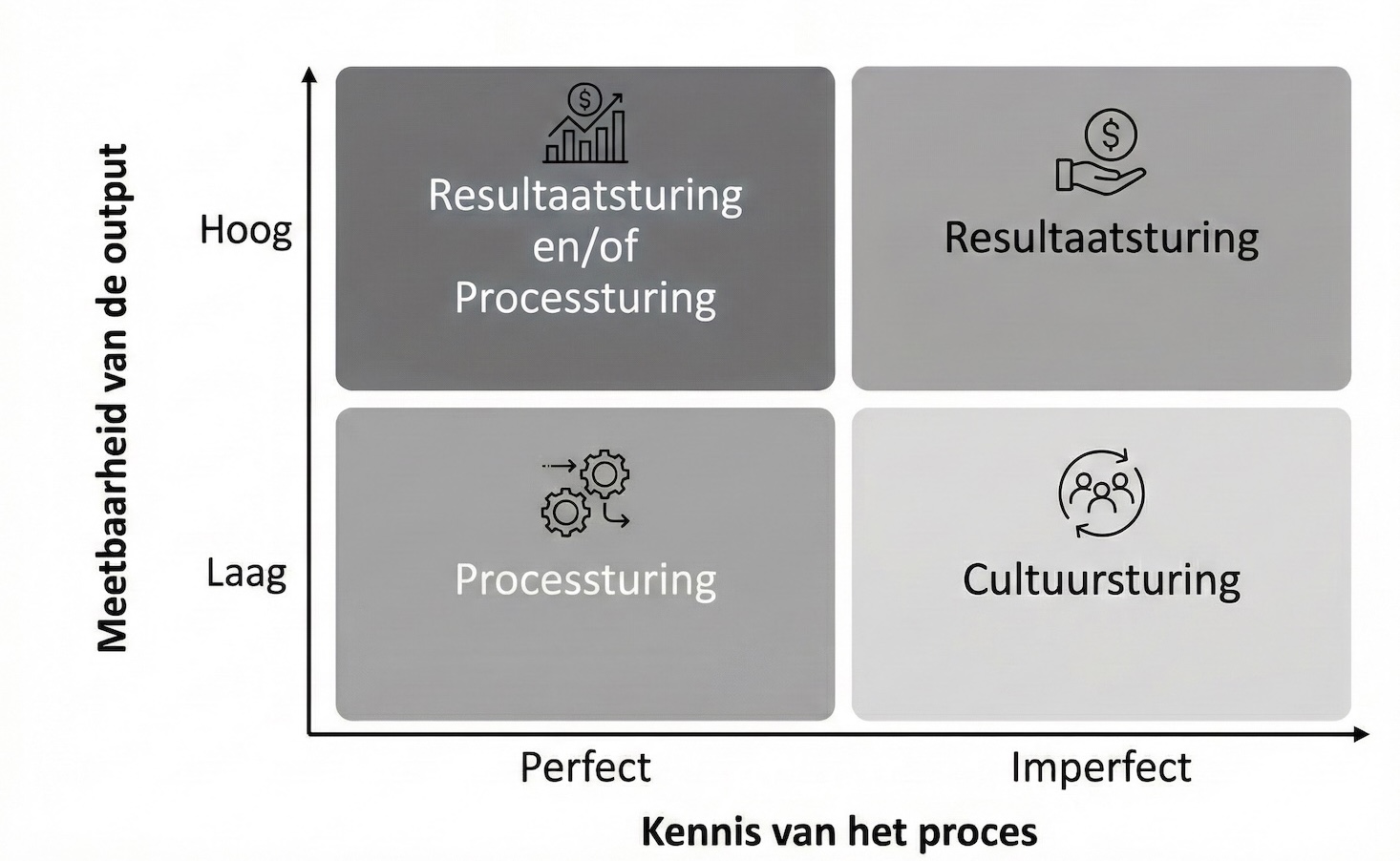Wanneer zowel output als proces goed te beoordelen zijn, werkt sturing op resultaten of op het proces. Als output meetbaar is maar het transformatieproces niet goed te specificeren is, ligt resultaatsturing voor de hand. Is het transformatieproces juist wel te specificeren maar de uitkomst lastig te meten, dan helpt processturing. In situaties waar beide beperkt zijn, zoals in veel professionele en publieke domeinen, blijft cultuursturing over. Ouchi noemt dit clan control. Gedeelde waarden, vakmanschap, sociale normering en vertrouwen vormen dan de belangrijkste basis voor coördinatie en kwaliteit.