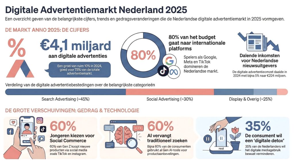 Eind 2025 is digital advertising in Nederland volwassen. In 2024 bedroegen de digitale advertentie-bestedingen in Nederland ruim €4,1 miljard, een groei van ruim 10 procent ten opzichte van het jaar daarvoor (VIA/Deloitte). Daarmee is digital goed voor grofweg driekwart van de totale advertentiemarkt.