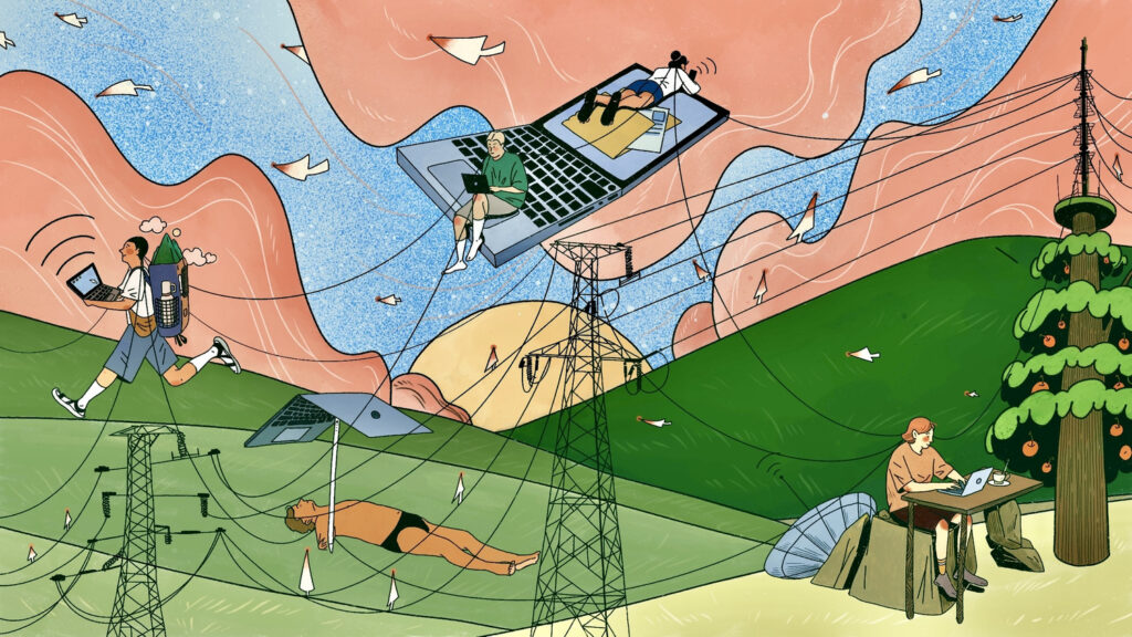 In haar serie Digital Nomads bijvoorbeeld, zie je geen perfecte digitale toekomst. Je ziet mensen die werken terwijl ze zitten, lopen, wachten of onderweg zijn. Laptops worden zonneschermen, kabels lopen door het landschap en kleine cursorvogels vliegen rond. Daarmee laat ze zien dat digitaal werk altijd plaatsvindt in de echte wereld, met echte mensen die ergens zijn en iets voelen.