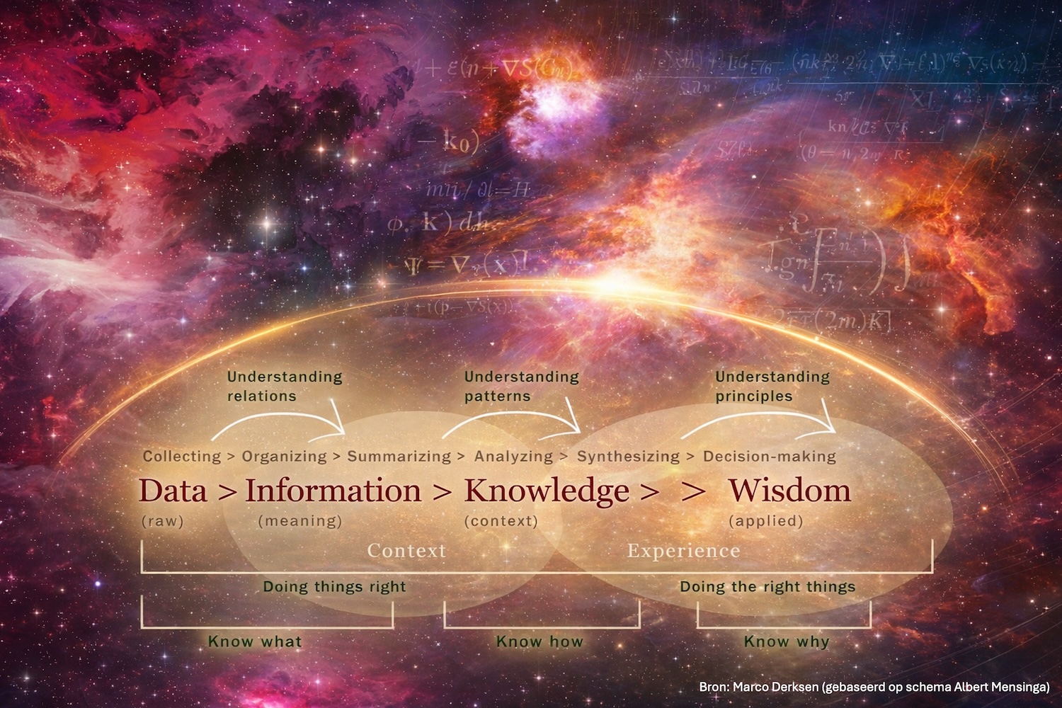Een eenvoudig denkkader om die vraag te verkennen is het zogenoemde DIKW-model, dat al decennia wordt gebruikt in informatie- en kennismanagement. Het onderscheidt vier niveaus: data, informatie, kennis en wijsheid. In het LinkedIn-bericht van Matthieu Weggeman werd dit kader opnieuw onder de aandacht gebracht door Albert Mensinga. Het laat zien dat naarmate men opschuift van data naar wijsheid, de focus verschuift van het verzamelen en ordenen van gegevens naar het begrijpen van samenhang, context en gevolgen. In die beweging wordt ook het verschil zichtbaar tussen de dingen goed doen en de goede dingen doen: efficiënt handelen binnen een gegeven kader tegenover oordeelkundig handelen met oog voor doelen en waarden. Jawel, dit sluit aan bij mijn onderscheid tussen digitalisering en digitale transformatie.